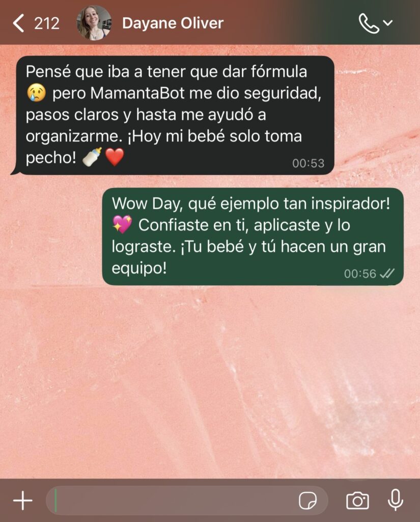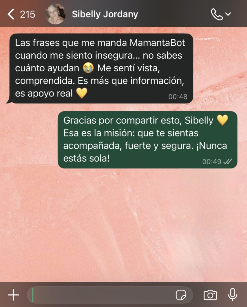 Todo funciona como una conversación personalizada: tú cuentas cómo estás, y MamantaBot te responde con lo que realmente importa.
