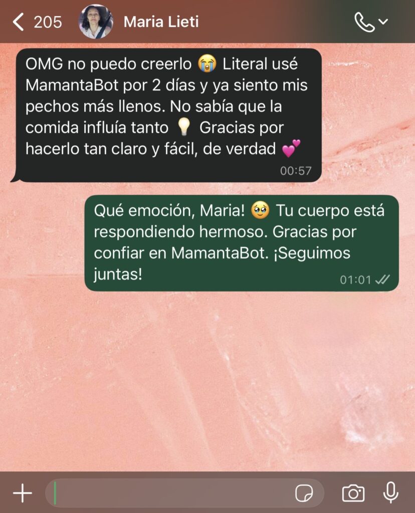 MamantaBot es una herramienta personalizada que te guía paso a paso para aumentar tu producción de leche. No es un curso ni un eBook — es una experiencia interactiva que se adapta a ti y te responde según tu etapa del posparto, tus síntomas y tus objetivos.